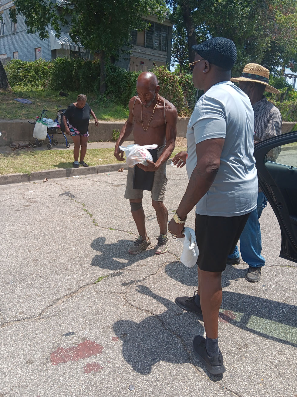 A collection of images showcasing community members engaged in outdoor activities, charitable work, and exchanging goods on a sunny day. The project represents the spirit of community involvement and outdoor service.